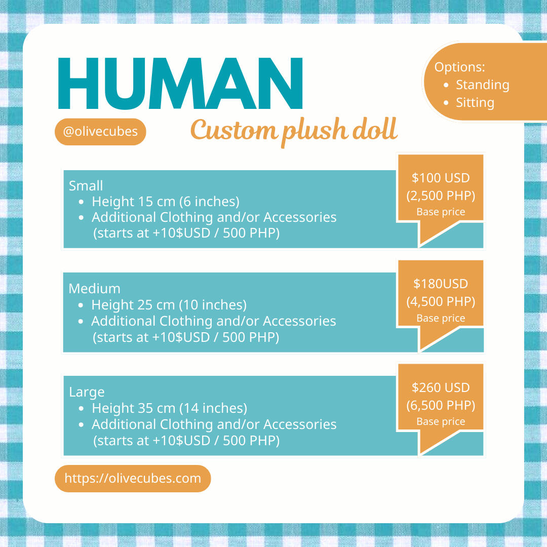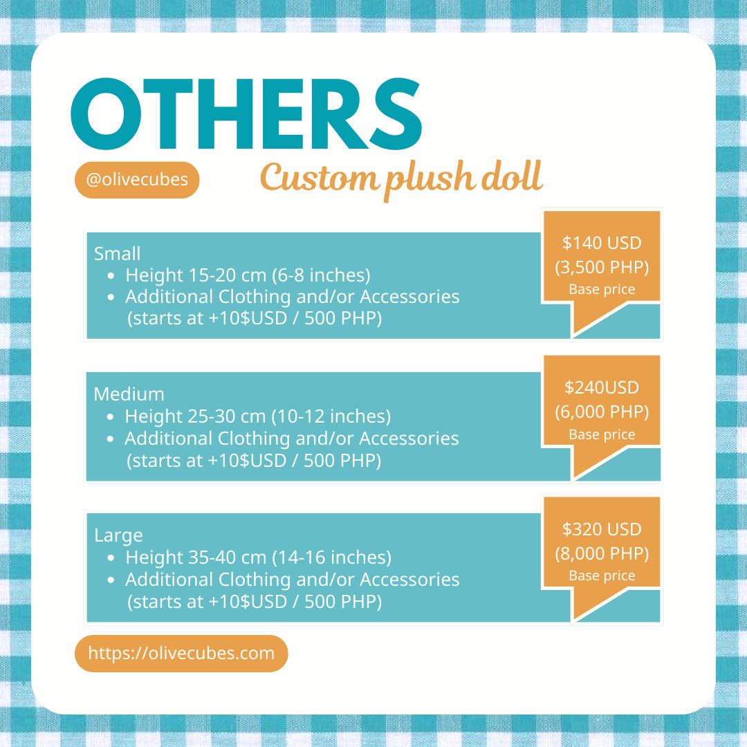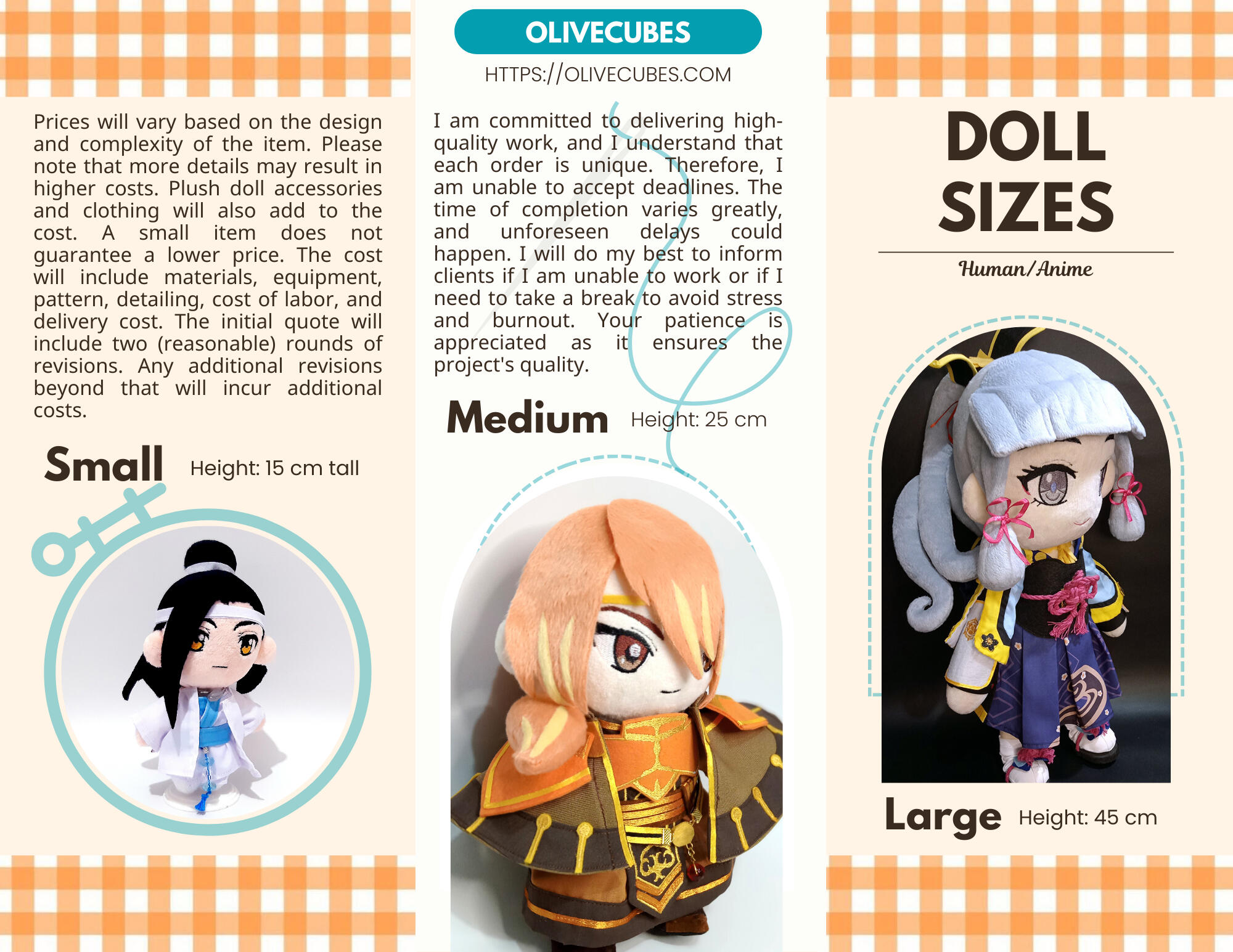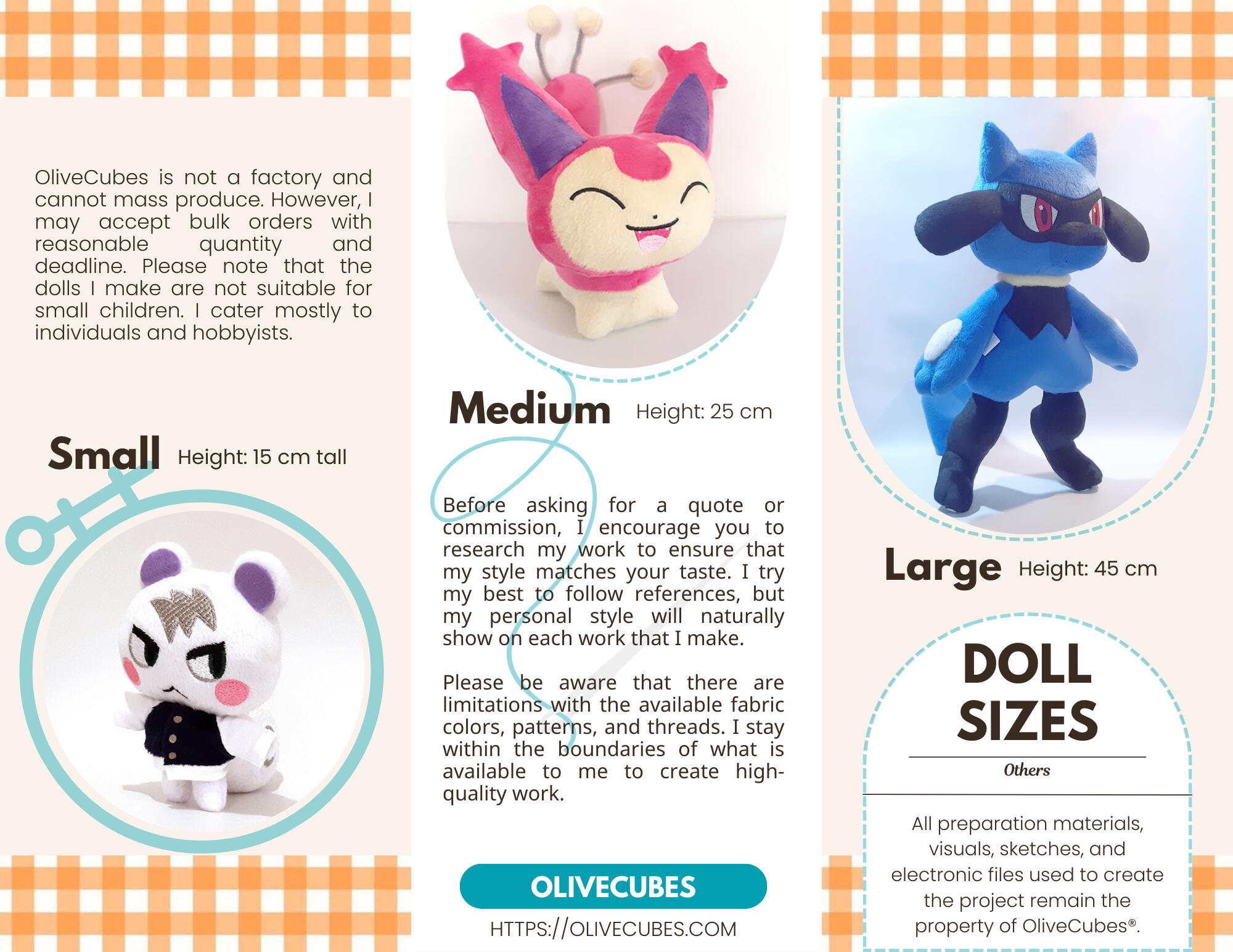 Work PolicyOliveCubes is not a factory and cannot mass produce. Please note that the dolls I make are not suitable for small children. I cater mostly to individuals and hobbyists. Before asking for a quote or commission, I encourage you to research my work to ensure that my style matches your taste. I try my best to follow references, but my personal style will naturally show on each work that I make.Please be aware that there are limitations with the available fabric colors, patterns, and threads. I stay within the boundaries of what is available to me to create high-quality work. All preparation materials, visuals, sketches, and electronic files used to create the project remain the property of OliveCubes®.